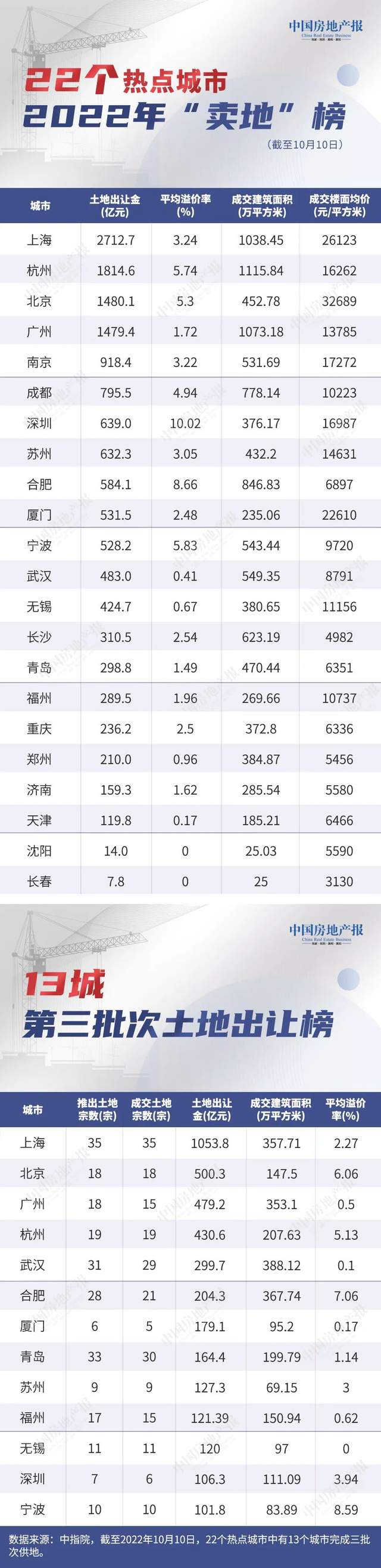 從截至10月10日22個熱點城市土地出讓情況看,底價成交、低溢價成為主流。根據(jù)中指院數(shù)據(jù),上海土地出讓金最高,達到2712.7億元,超過去年全年的1954.3億元;但3個批次土地出讓中,溢價成交地塊占比不到50%,平均溢價率3.24%,低于去年的3.77%。