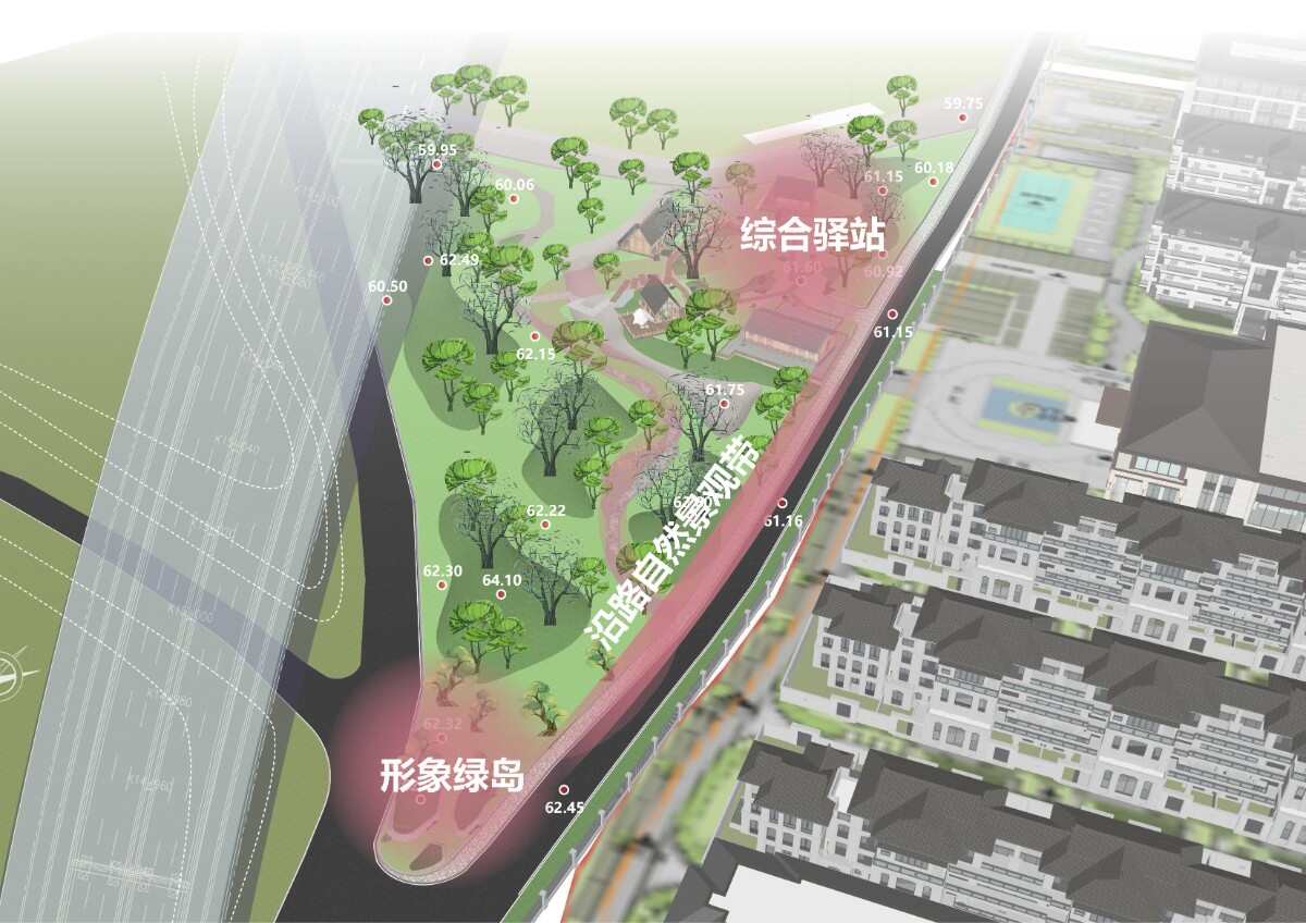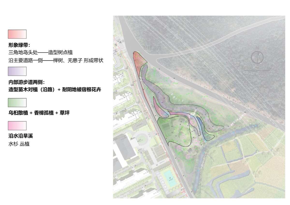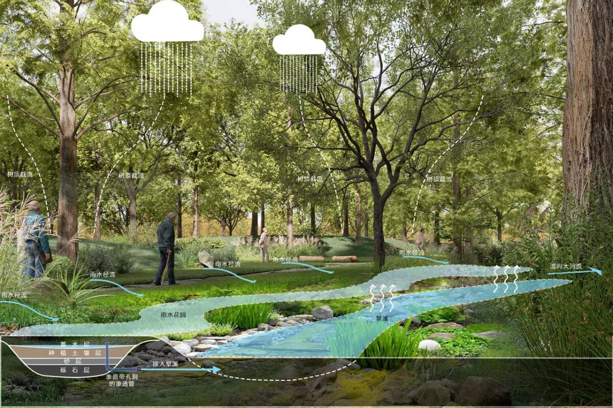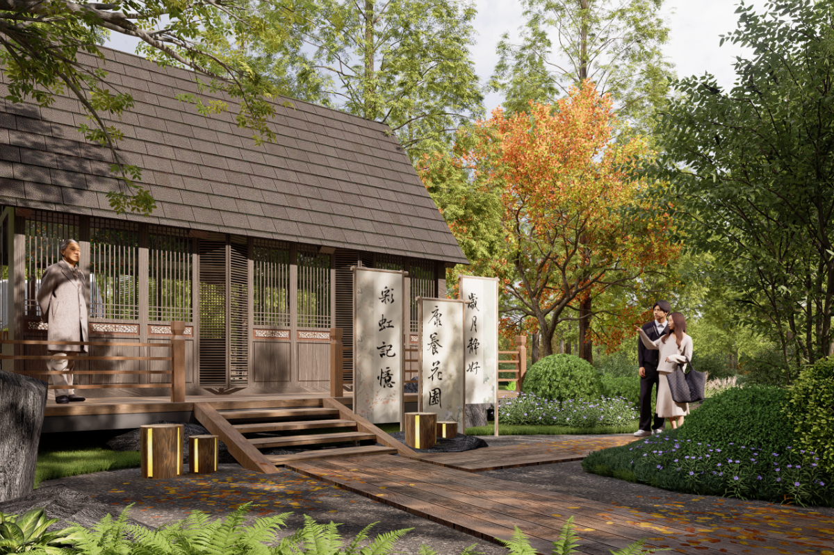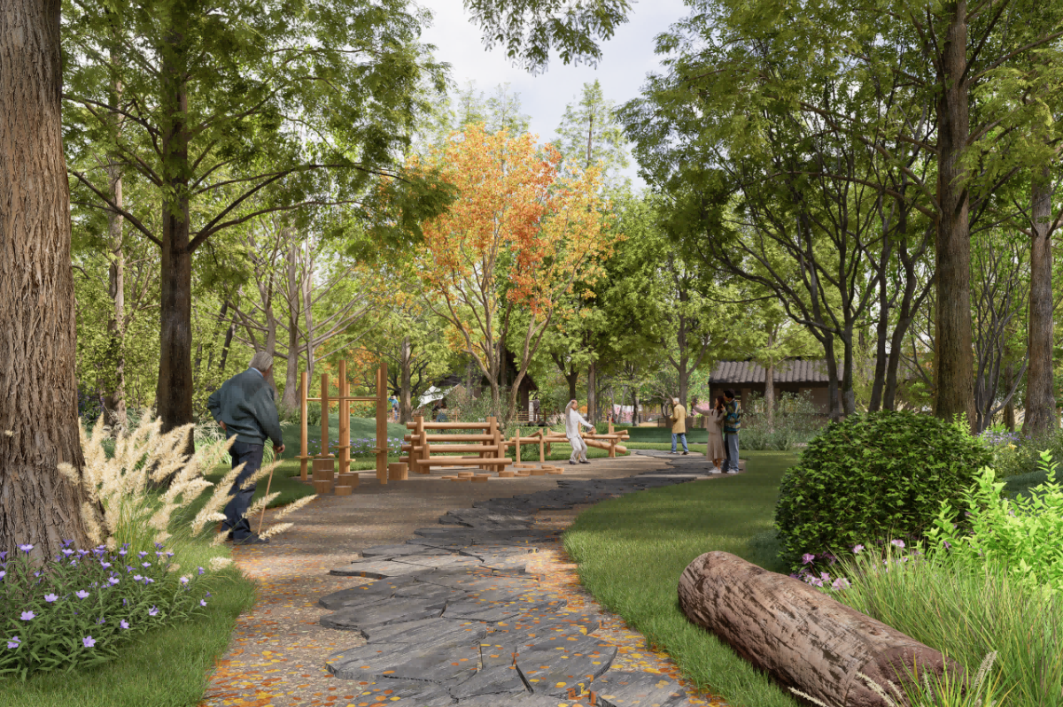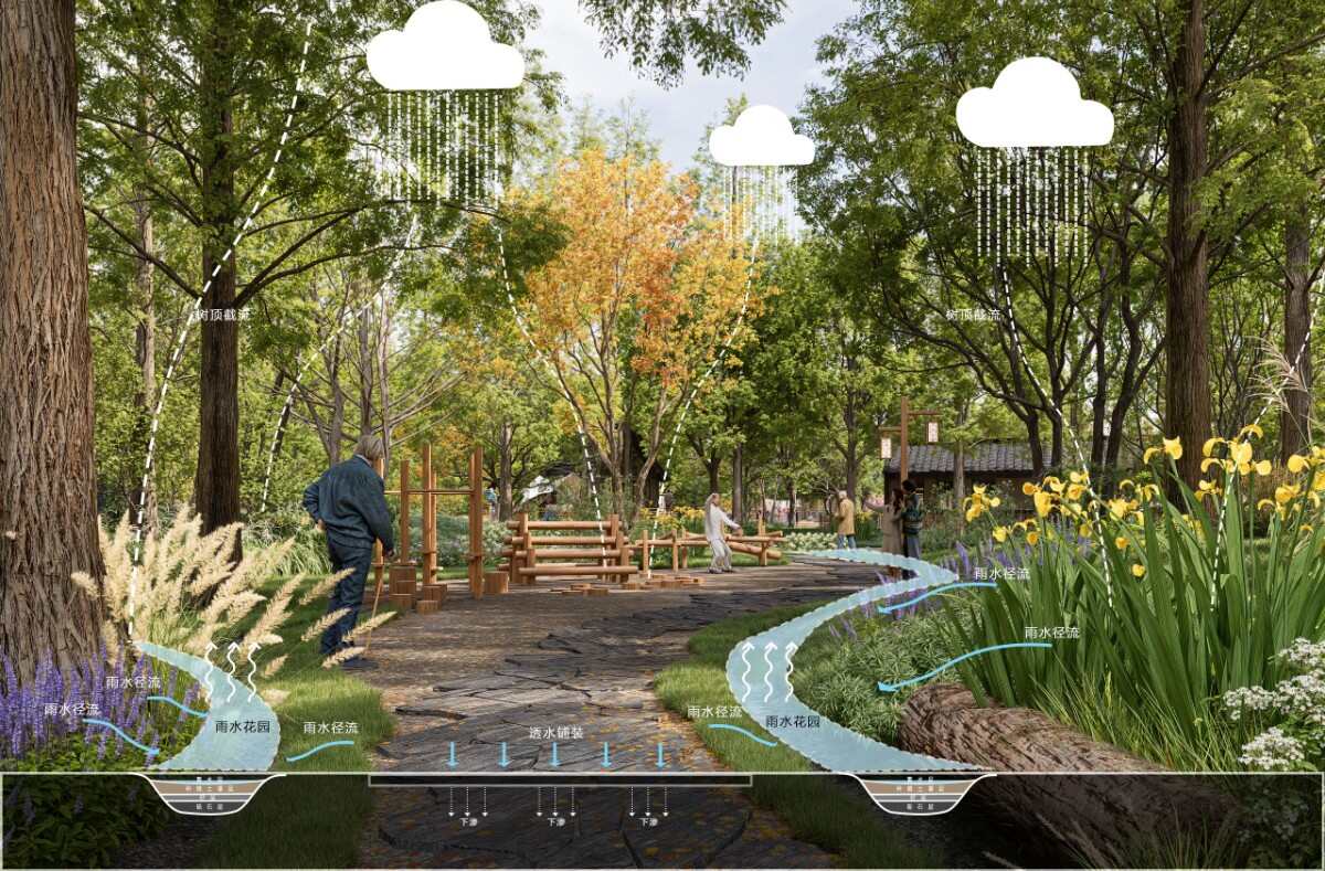 以生態(tài)修復(fù)為核心策略,通過保留現(xiàn)狀喬木林、補植水杉群落與耐陰地被,構(gòu)建多層次植物生態(tài)系統(tǒng),同時改造溝渠為生態(tài)旱溪,結(jié)合礫石步道與木棧道系統(tǒng),減少對原生土壤的擾動,增強雨水滲透與生物棲息功能。方案深度融合《西園雅集圖》的文人雅集文化,以"兩點一線"結(jié)構(gòu)(形象綠島、林下漫步道、社交驛站)為框架,在林地間嵌入低干預(yù)構(gòu)筑物,采用裝配式木屋與本土材料再利用,打造兼具生態(tài)修復(fù)與文化傳承的復(fù)合型空間,實現(xiàn)"生態(tài)為底、文化為魂"的可持續(xù)發(fā)展目標。本項目以生態(tài)修復(fù)為核心策略,通過保留現(xiàn)狀喬木林、補植水杉群落與耐陰地被,構(gòu)建多層次植物生態(tài)系統(tǒng),同時改造溝渠為生態(tài)旱溪,結(jié)合礫石步道與木棧道系統(tǒng),減少對原生土壤的擾動,增強雨水滲透與生物棲息功能。方案深度融合《西園雅集圖》的文人雅集文化,以"兩點一線"結(jié)構(gòu)(形象綠島、林下漫步道、社交驛站)為框架,在林地間嵌入低干預(yù)構(gòu)筑物,采用裝配式木屋與本土材料再利用,打造兼具生態(tài)修復(fù)與文化傳承的復(fù)合型空間,實現(xiàn)"生態(tài)為底、文化為魂"的可持續(xù)發(fā)展目標。