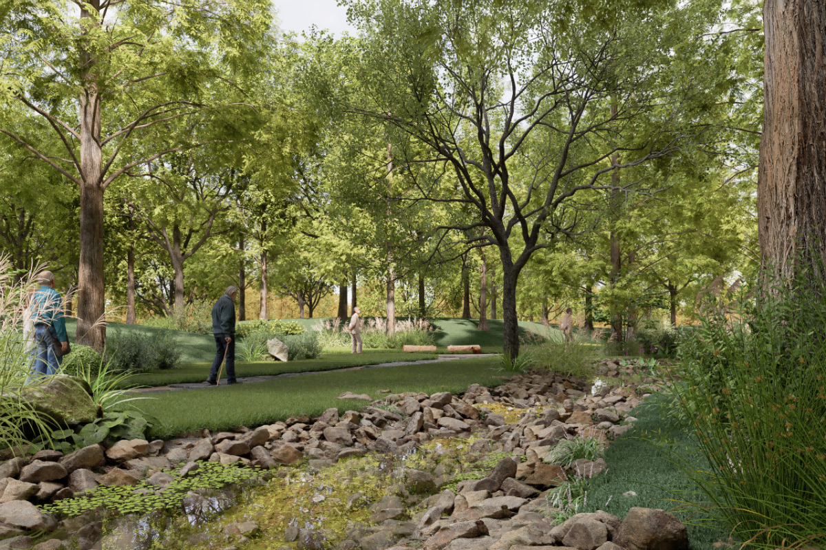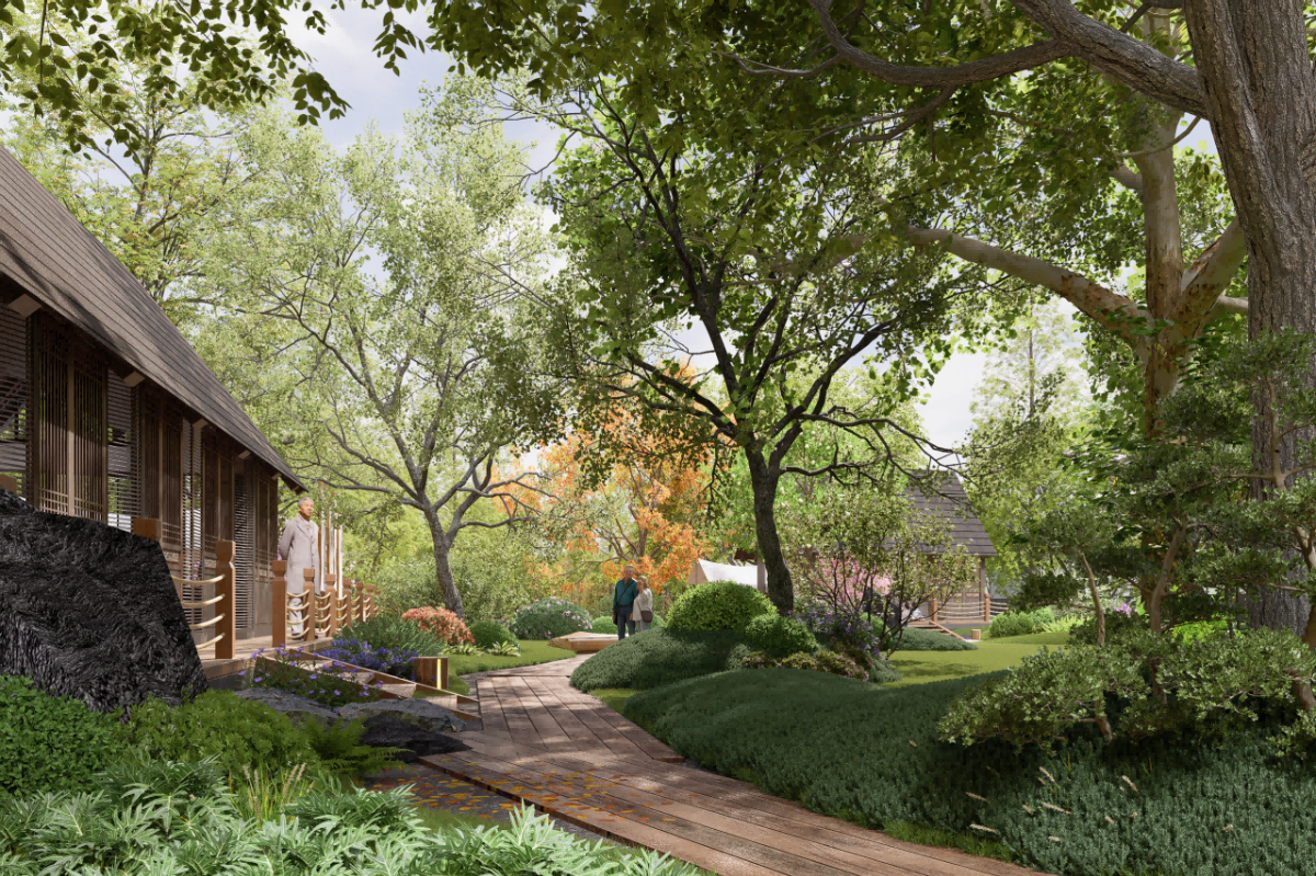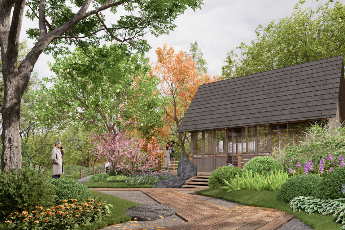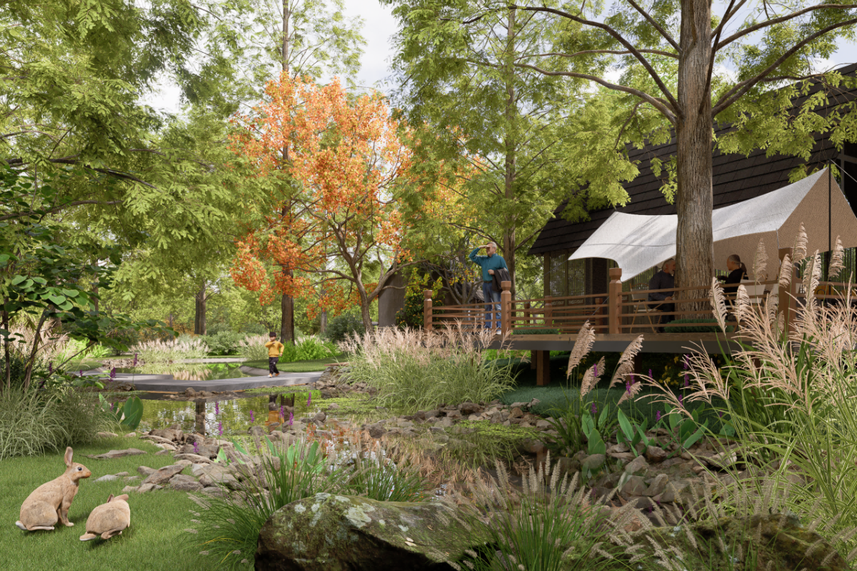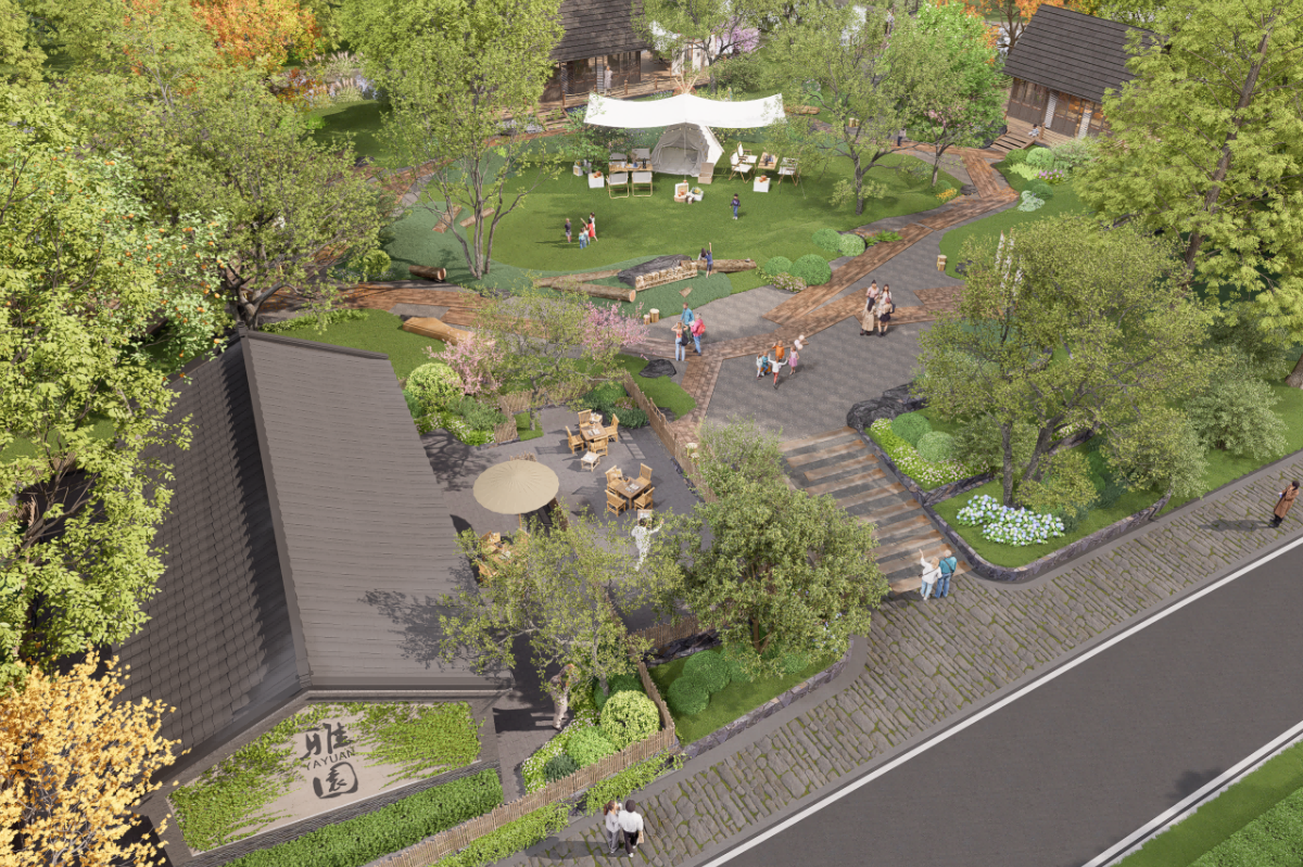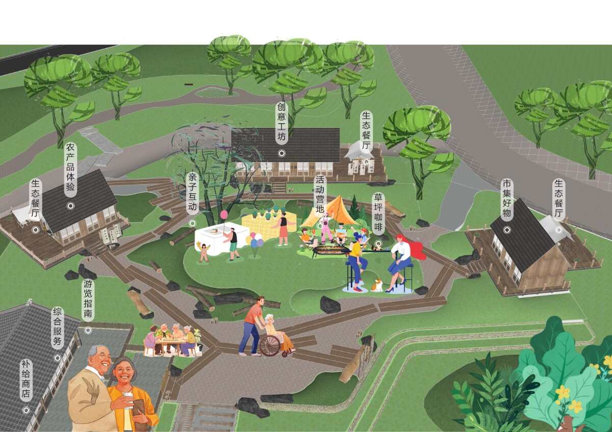 以生態(tài)修復(fù)為核心策略,通過保留現(xiàn)狀喬木林、補植水杉群落與耐陰地被,構(gòu)建多層次植物生態(tài)系統(tǒng),同時改造溝渠為生態(tài)旱溪,結(jié)合礫石步道與木棧道系統(tǒng),減少對原生土壤的擾動,增強雨水滲透與生物棲息功能。方案深度融合《西園雅集圖》的文人雅集文化,以"兩點一線"結(jié)構(gòu)(形象綠島、林下漫步道、社交驛站)為框架,在林地間嵌入低干預(yù)構(gòu)筑物,采用裝配式木屋與本土材料再利用,打造兼具生態(tài)修復(fù)與文化傳承的復(fù)合型空間,實現(xiàn)"生態(tài)為底、文化為魂"的可持續(xù)發(fā)展目標。本項目以生態(tài)修復(fù)為核心策略,通過保留現(xiàn)狀喬木林、補植水杉群落與耐陰地被,構(gòu)建多層次植物生態(tài)系統(tǒng),同時改造溝渠為生態(tài)旱溪,結(jié)合礫石步道與木棧道系統(tǒng),減少對原生土壤的擾動,增強雨水滲透與生物棲息功能。方案深度融合《西園雅集圖》的文人雅集文化,以"兩點一線"結(jié)構(gòu)(形象綠島、林下漫步道、社交驛站)為框架,在林地間嵌入低干預(yù)構(gòu)筑物,采用裝配式木屋與本土材料再利用,打造兼具生態(tài)修復(fù)與文化傳承的復(fù)合型空間,實現(xiàn)"生態(tài)為底、文化為魂"的可持續(xù)發(fā)展目標。
