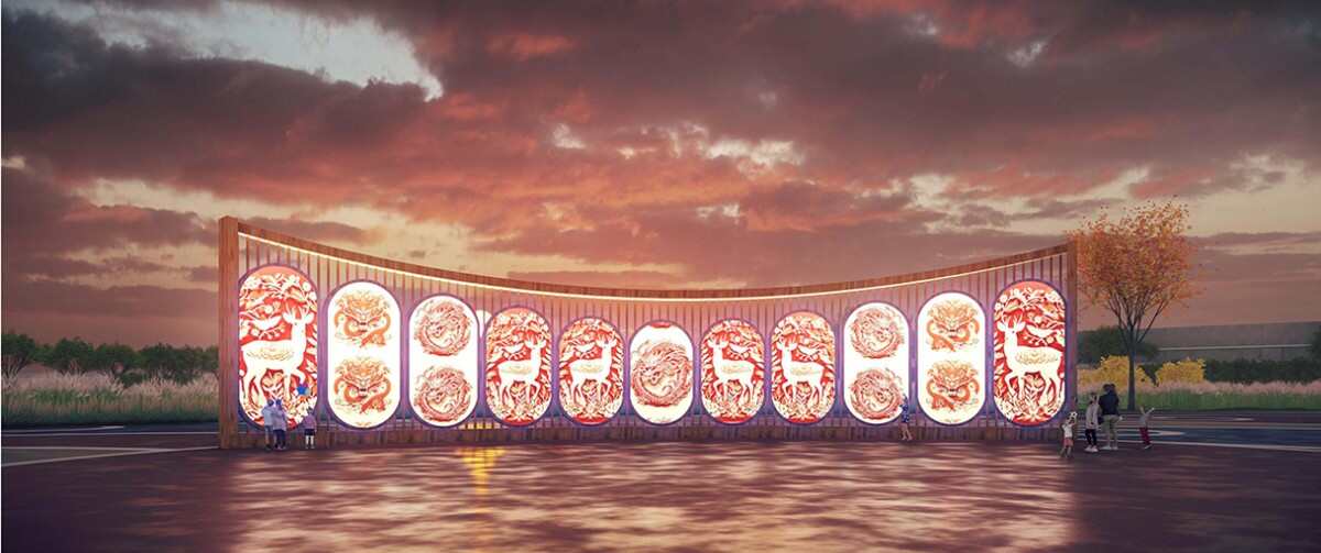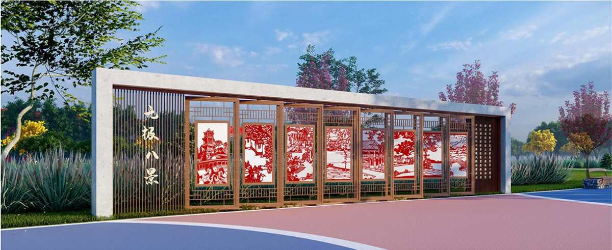 結(jié)合現(xiàn)狀丁壩,設(shè)置網(wǎng)紅打卡點。選用剪紙造型雕塑,凸顯場地文化性。