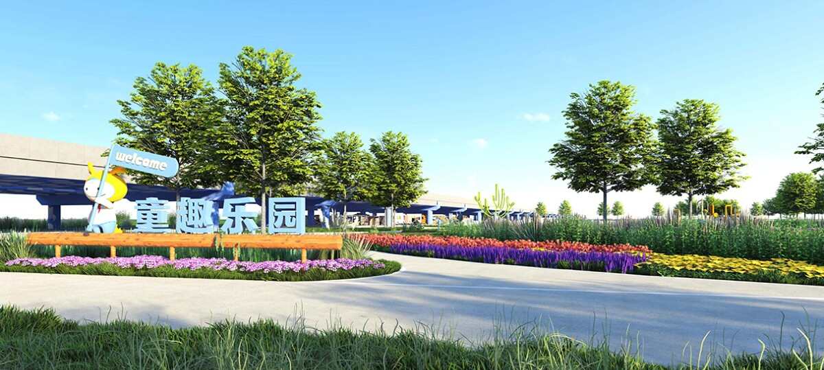 將現(xiàn)狀樹木進行保留,補植綠化,入口處設(shè)置區(qū)域標(biāo)識,強化場地歸屬感,同時保證國道南向北視覺效果,場地與定魏線設(shè)置阻車球,緊急狀態(tài)可行車,保障場地安全。休閑區(qū)入口設(shè)置入口標(biāo)識,引導(dǎo)游客進入場地,增加夜景亮化,豐富夜間景觀。