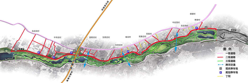 結(jié)合《無極縣滹沱河沿岸和美鄉(xiāng)村示范帶建設(shè)規(guī)劃》規(guī)劃13條南北向道路,增加通村道路,加強滹沱河對外交通聯(lián)系,帶動北側(cè)村莊產(chǎn)業(yè)發(fā)展。