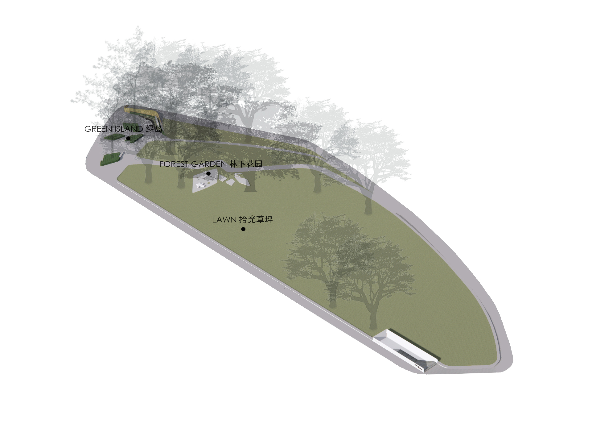 邊界的開放不僅僅是拆除圍墻,更多的是從空間上讓人可以有機會快速抵達公園內(nèi)部,流動的線形串聯(lián)起公園內(nèi)外里表的空間,讓城市生活融入公園空間內(nèi)部。遵從場地的本源訴求,開放出舒適的林下下沉空間,流動的空間勾勒出的曲線讓場地在高差起伏間,流動的空間在大開大合間,消減了公園內(nèi)外以及城市道路帶來的高差,帶來了快速抵達公園核心水景的花園步道,以及臺地花園,活動廣場等等。